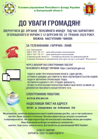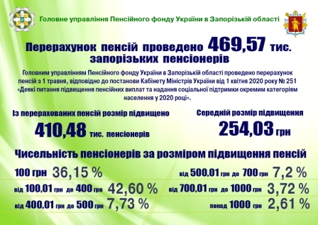 Головним управлінням Пенсійного фонду України в Запорізькій області для забезпечення індексації пенсій з 1 травня проведено перерахунок пенсій, відповідно до постанови Кабінету Міністрів України від 1 квітня 2020 року № 251 «Деякі питання підвищення пенсійних виплат та надання соціальної підтримки окремим категоріям населення у 2020 році».