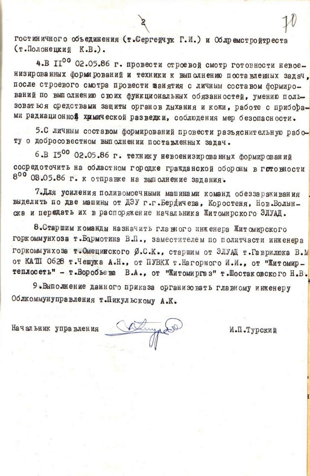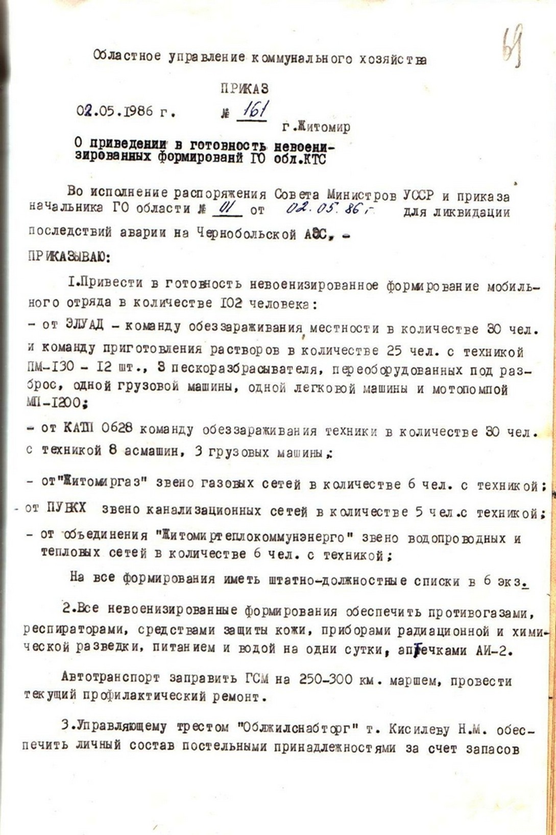 | Наказ Житомирського обласного управління комунального господарства від 02 травня 1986 року № 161 «О приведении в готовность невоенизированных формирований ГО обл. КТС». |
