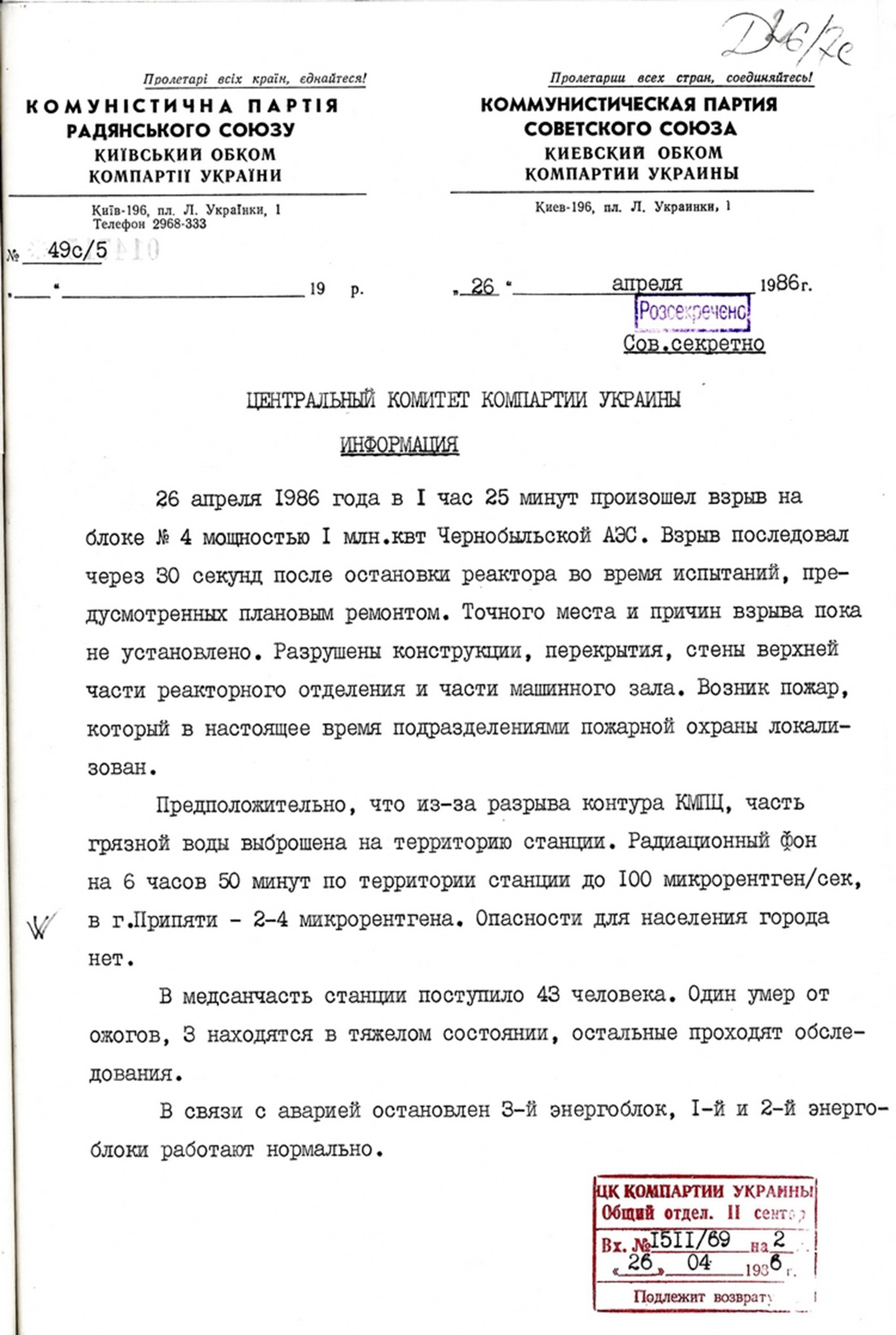 | Інформаційне повідомлення секретаря Київського обкому партії Г. Ревенка в ЦК КПУ про вибух на блоці № 4 Чорнобильської АЕС. 26 квітня 1986 р. |