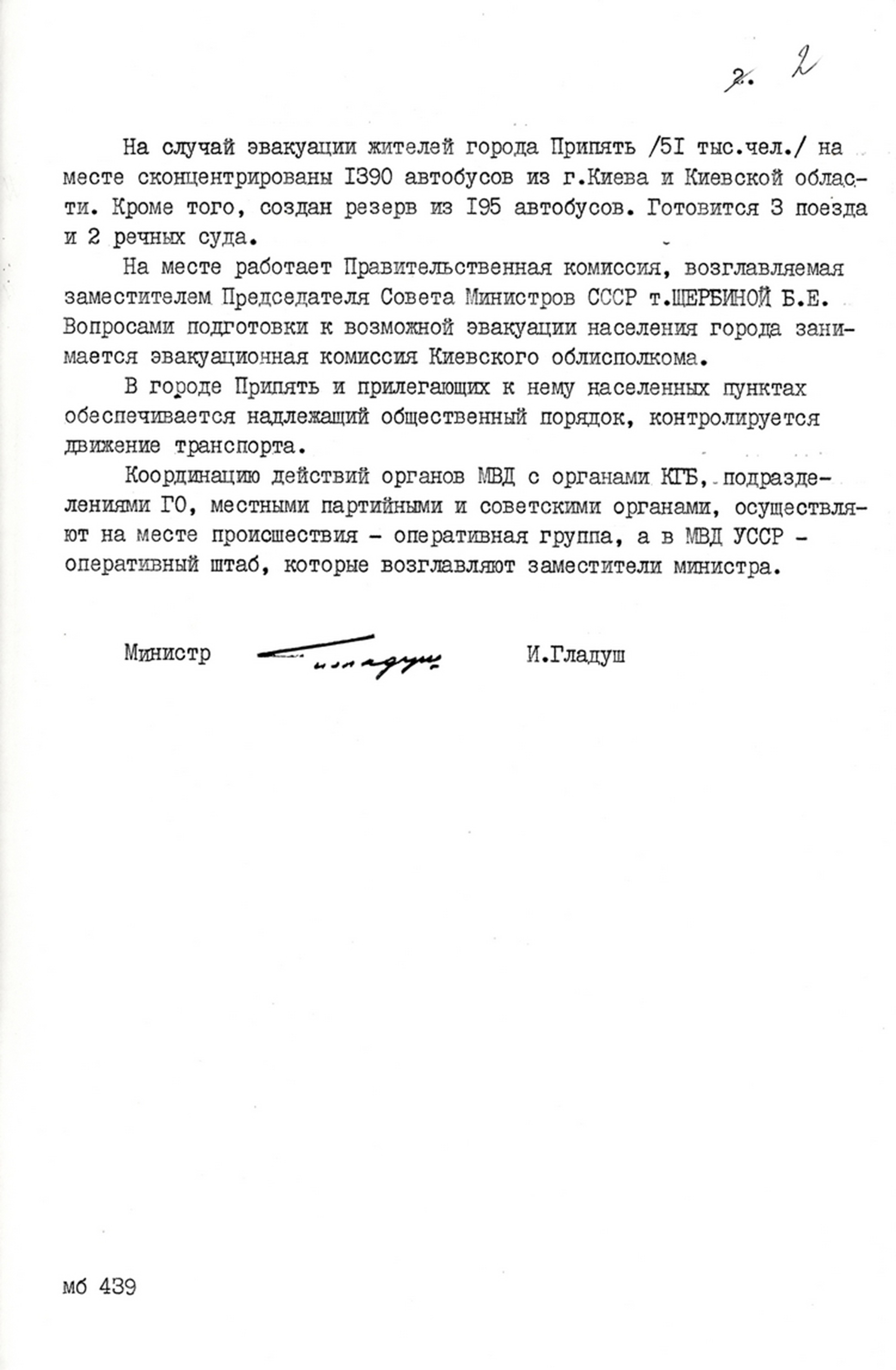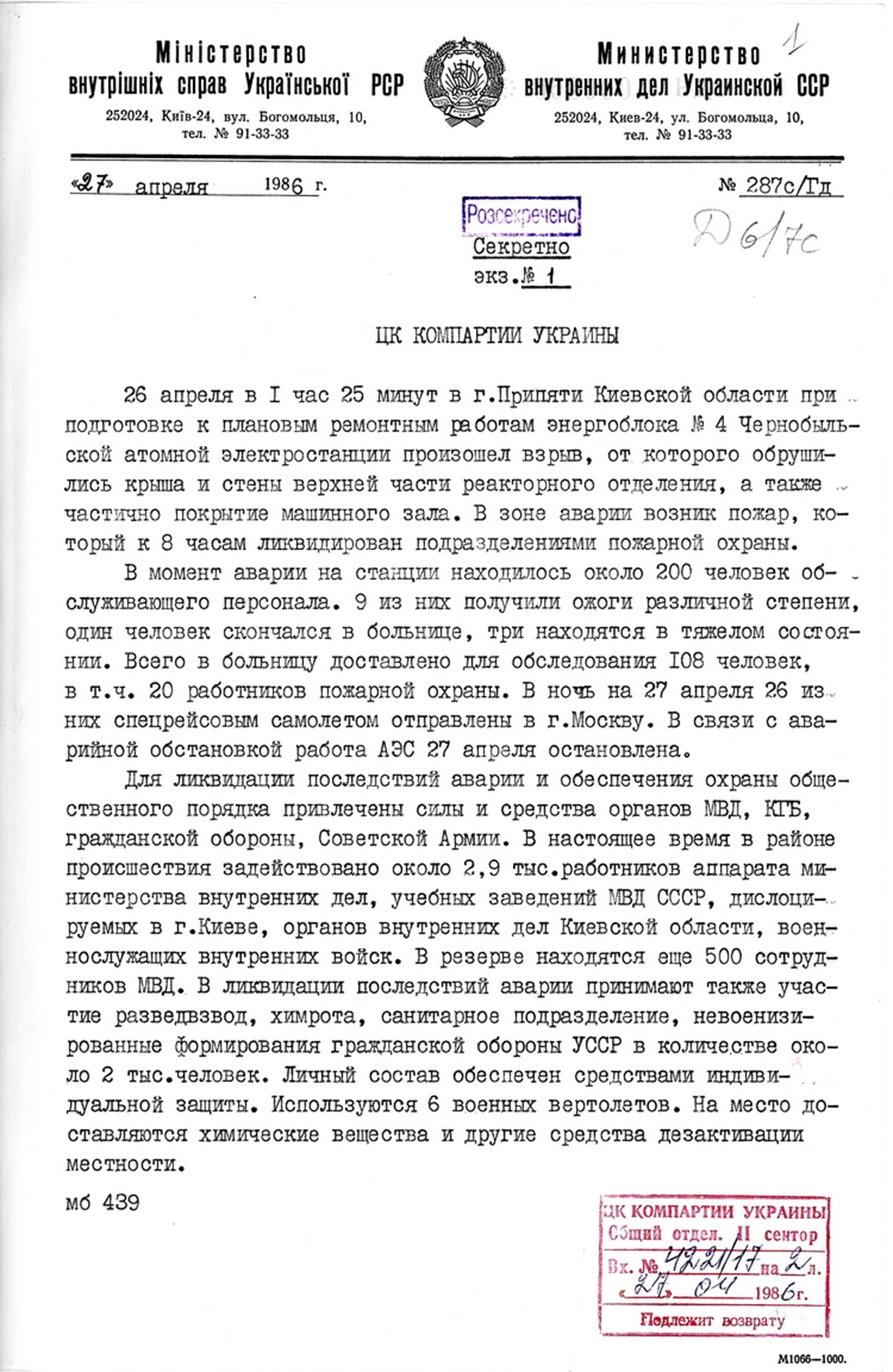| Доповідна записка міністра внутрішніх справ УРСР І. Гладуша в ЦК КПУ про заходи з ліквідації наслідків аварії на Чорнобильській АЕС. 27 квітня 1986 р. |