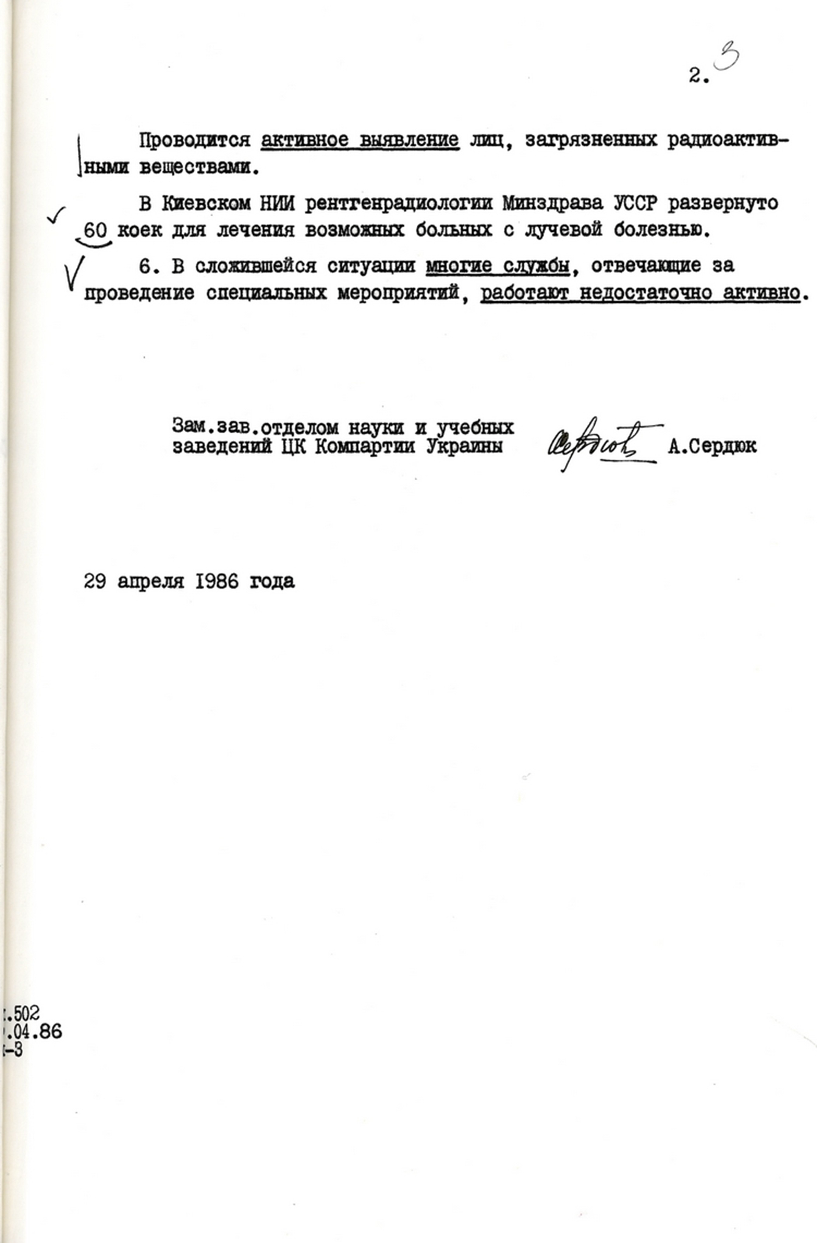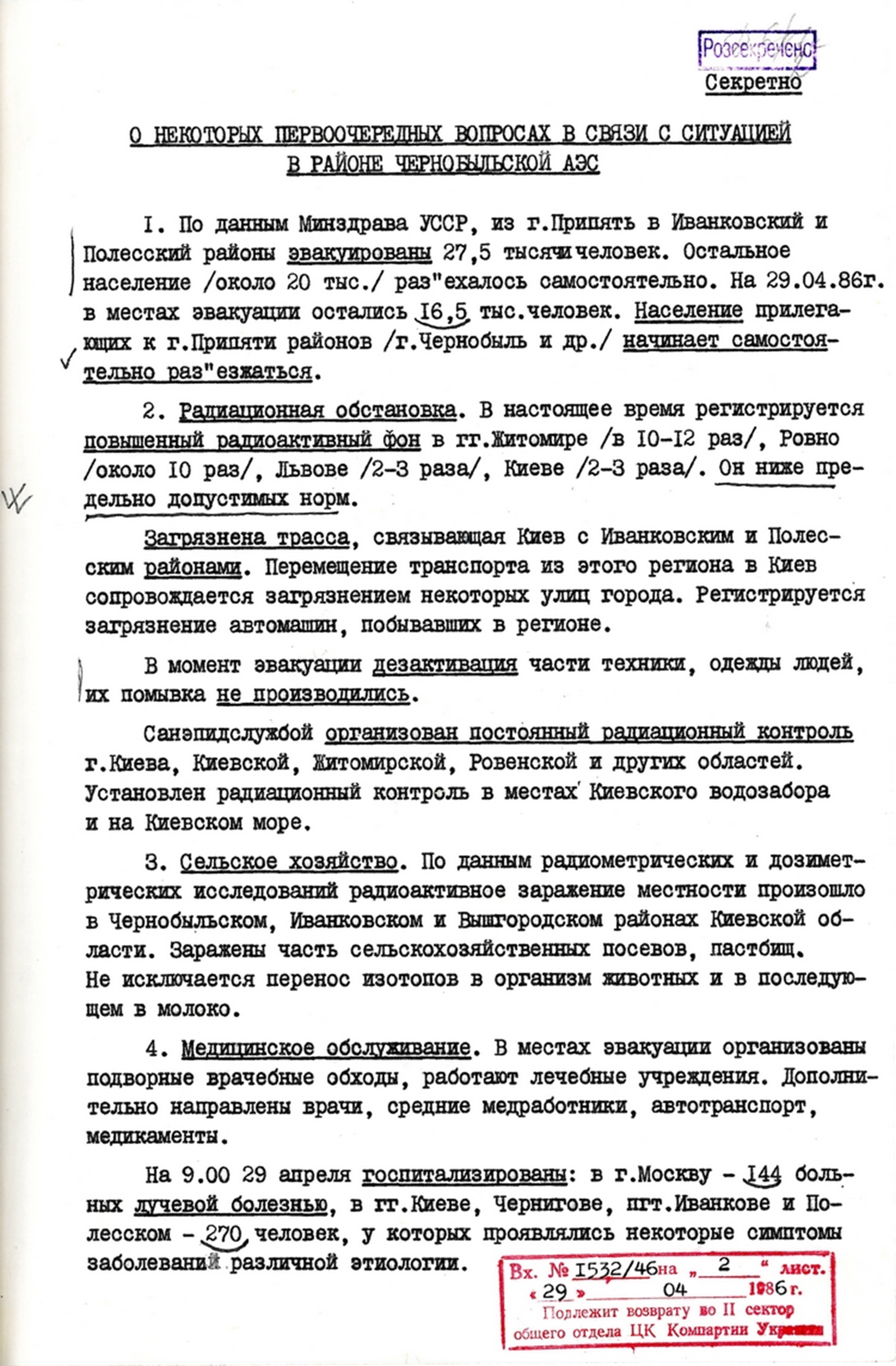 | Доповідна записка відділу науки і навчальних закладів ЦК КПУ про деякі першочергові питання у зв’язку із ситуацією в районі Чорнобильської АЕС. 29 квітня 1986 р. |