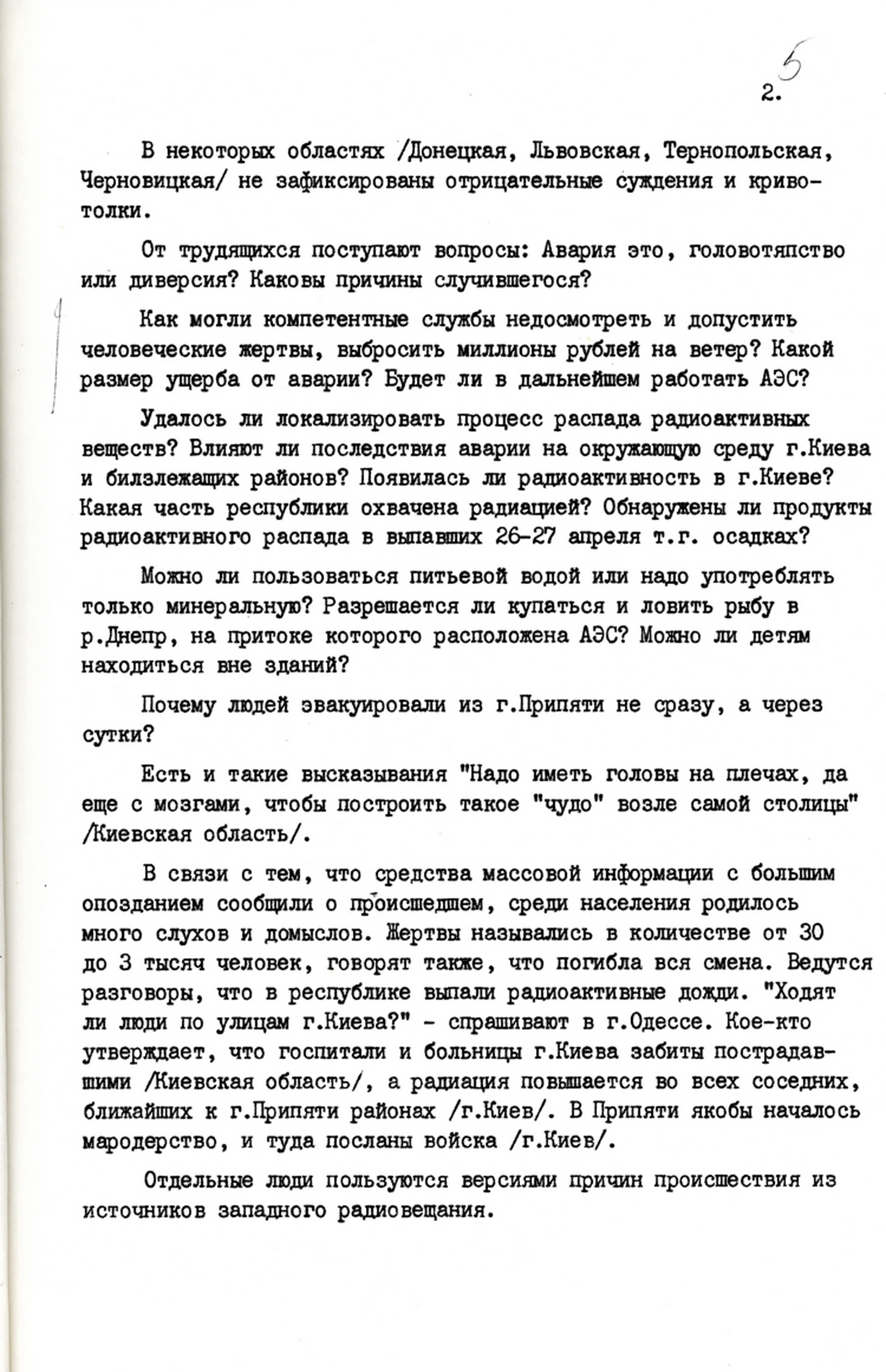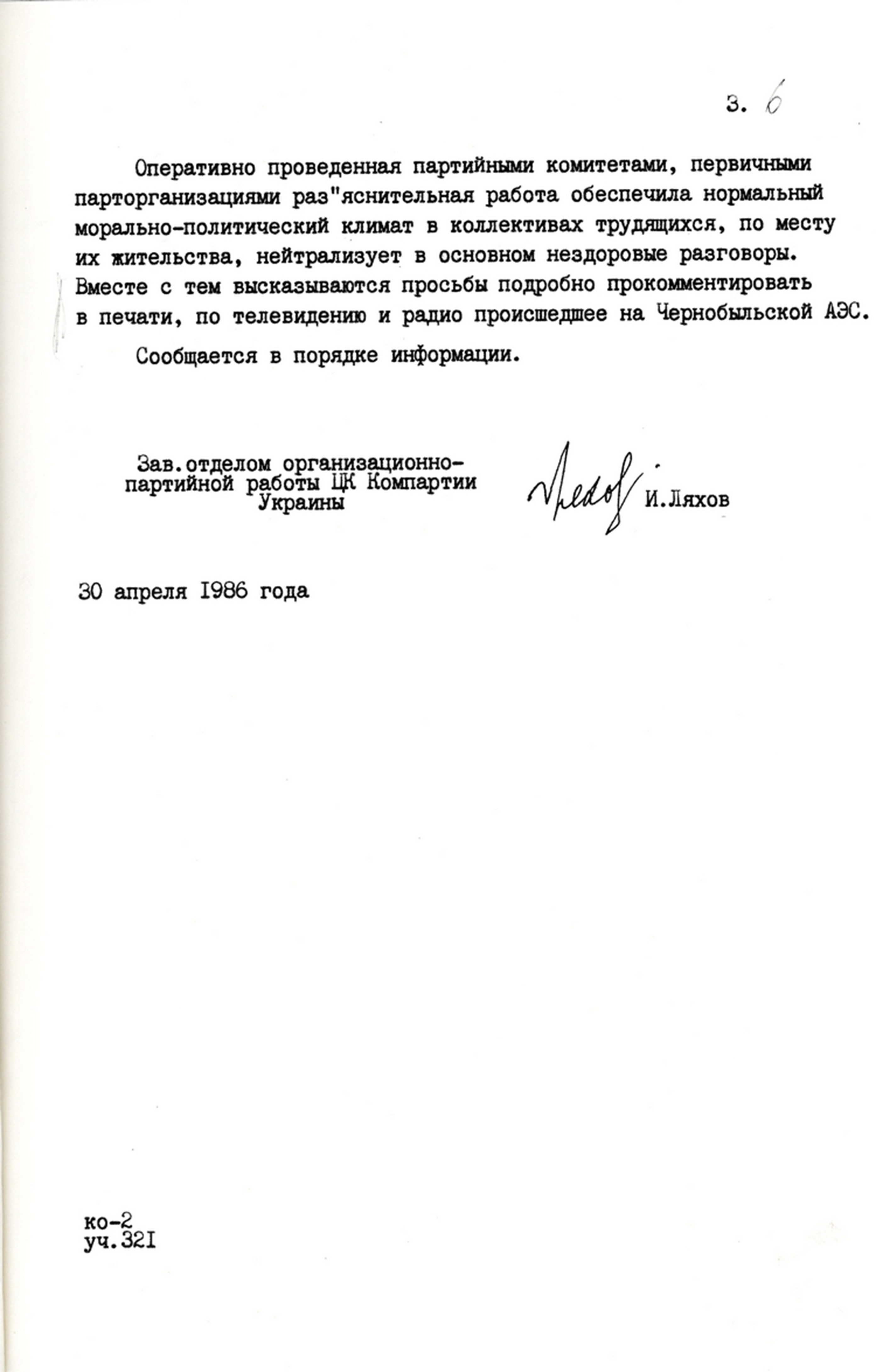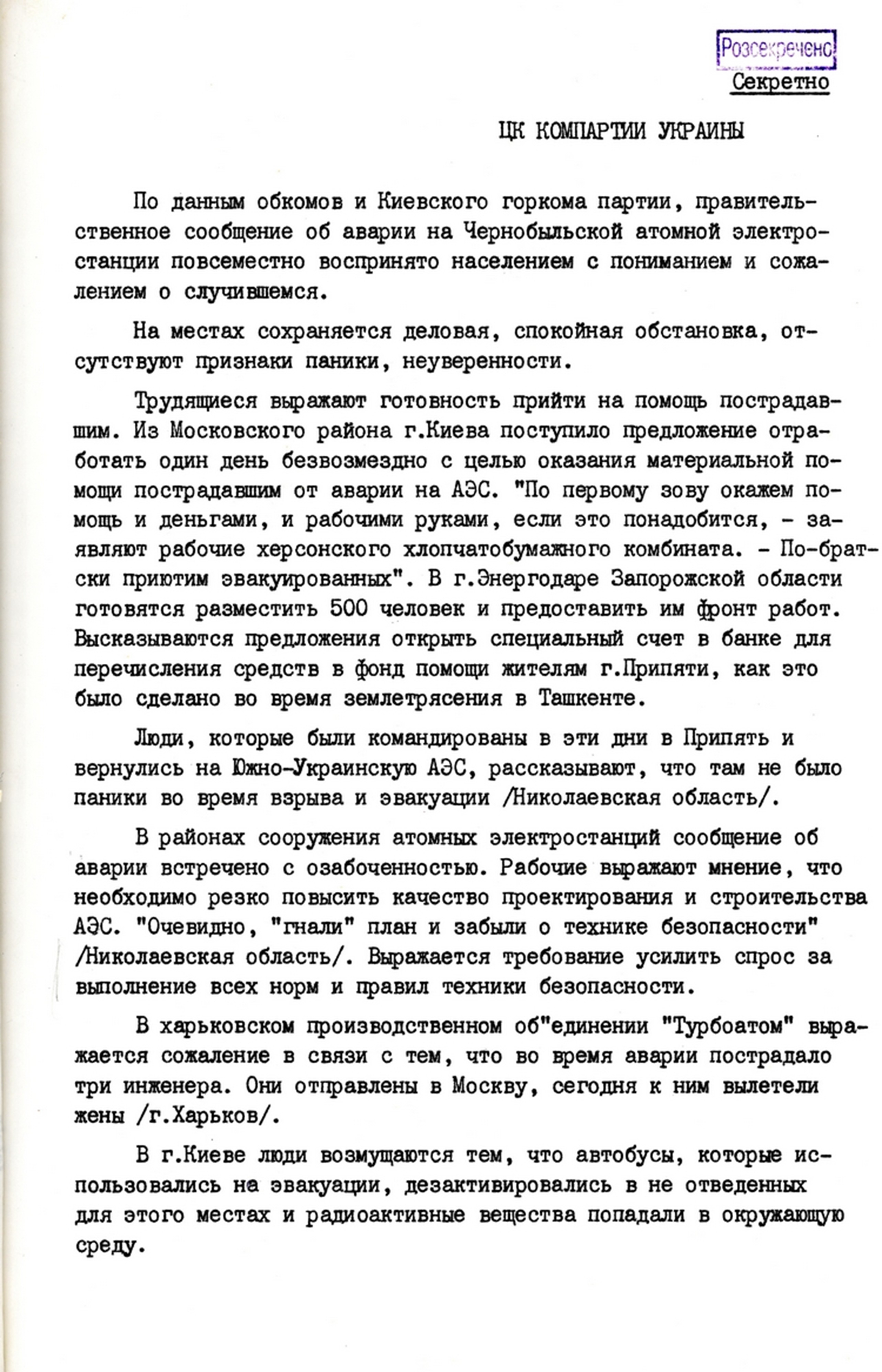 | Повідомлення відділу організаційно-партійної роботи ЦК КПУ про морально-психологічний стан населення та роз’яснювальну роботу партійних органів у зв’язку з аварією на Чорнобильській АЕС. 30 квітня 1986 р. |