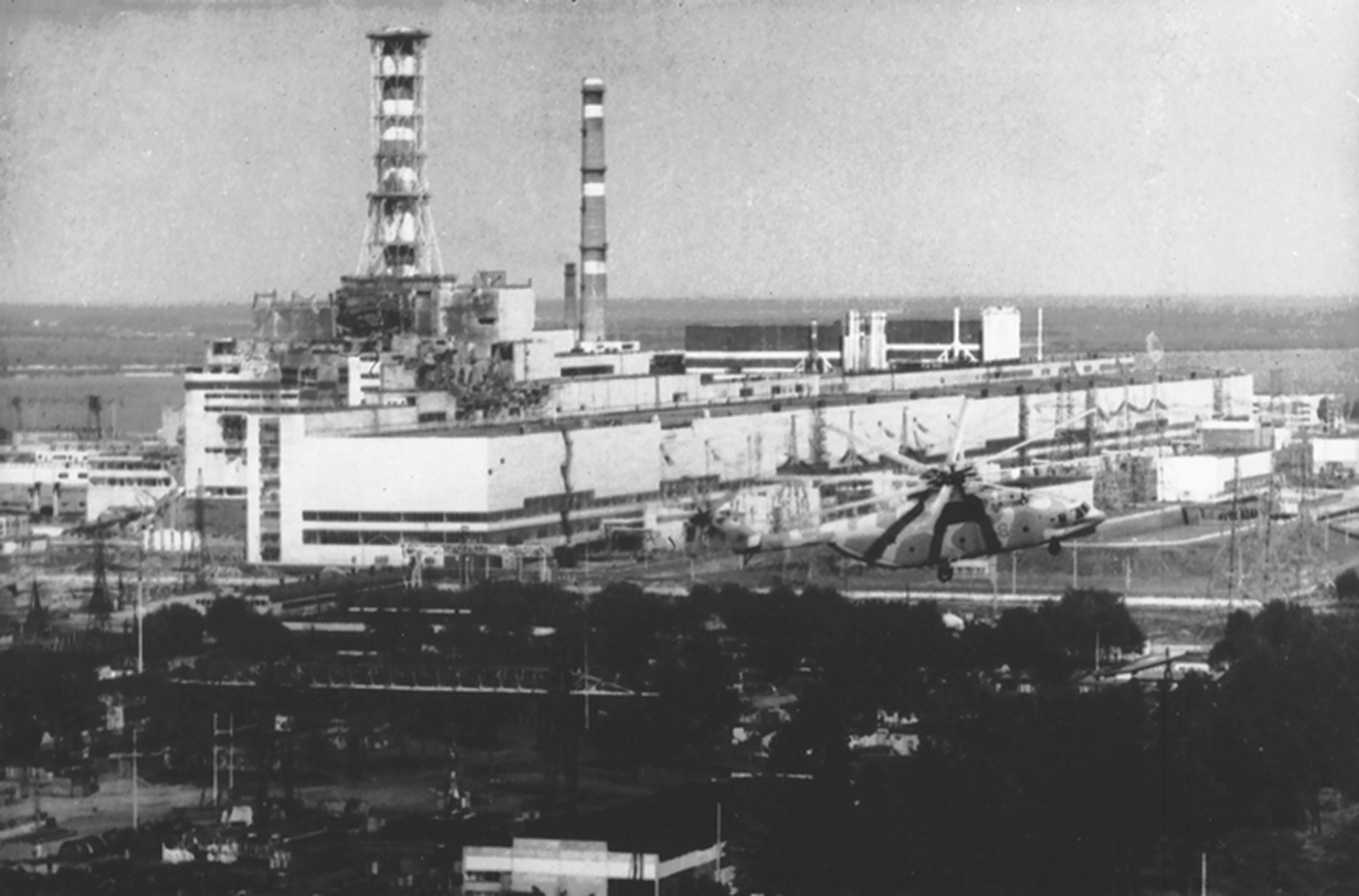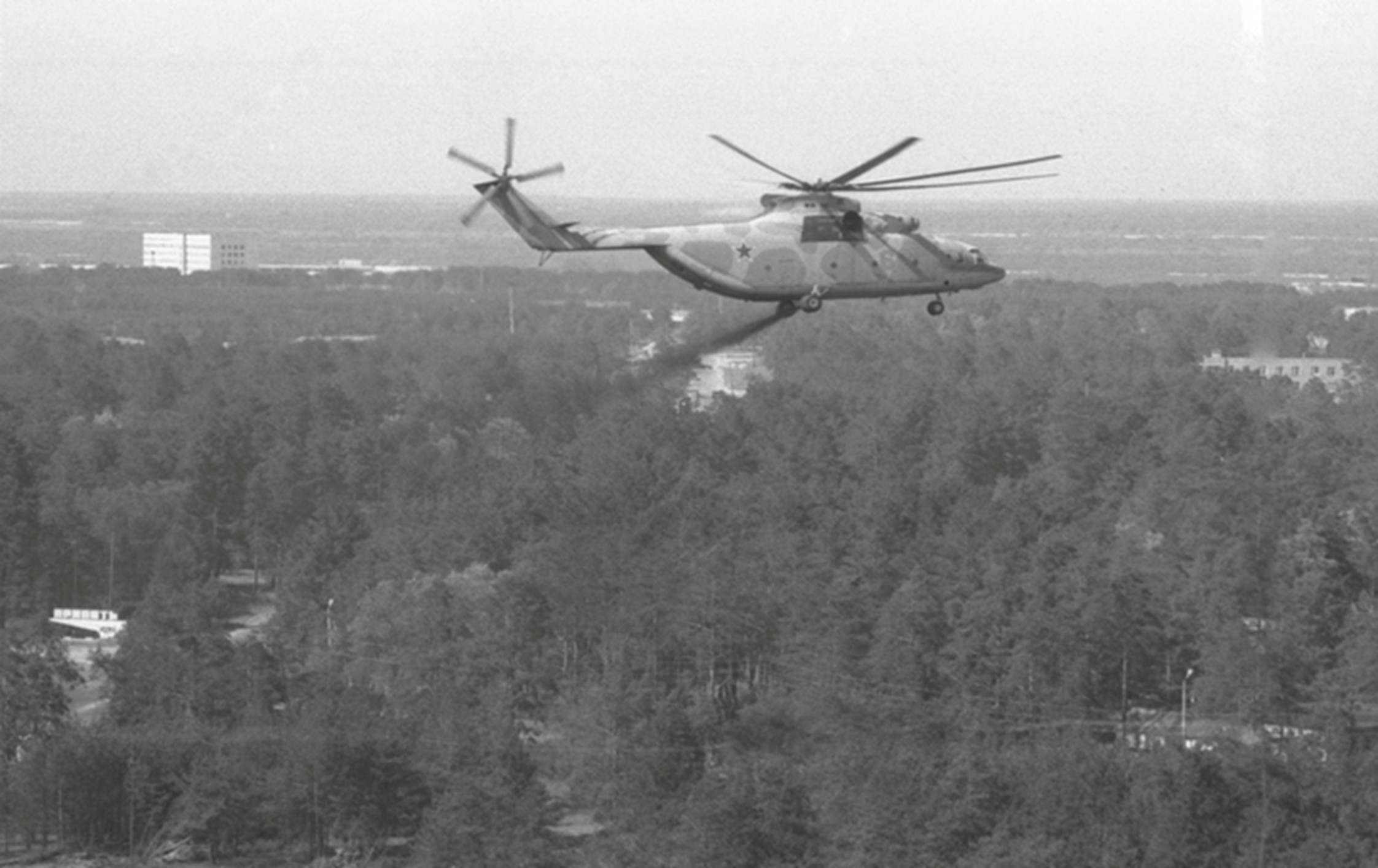 | Дезактивація з повітря території енергоблоку № 4 Чорнобильської АЕС ім. В. І. Леніна. Київська обл., травень 1986 р. Автор зйомки В. Зуфаров. |