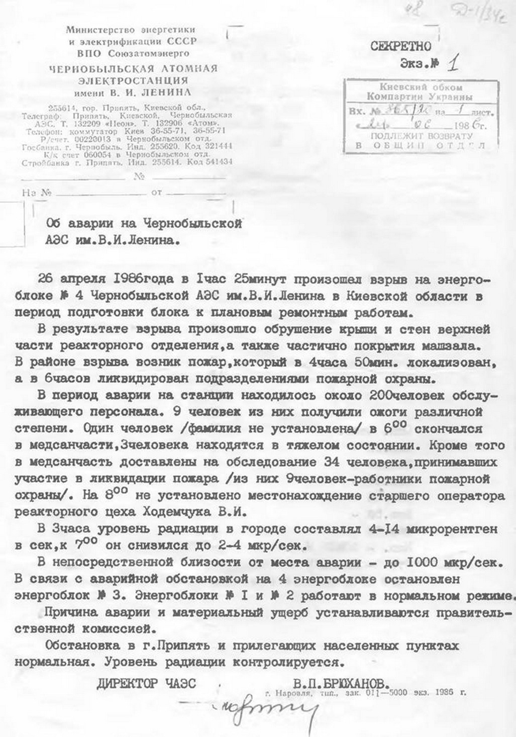 | Лист-повідомлення директора ЧАЕС В.П.Брюханова «Про аварію на Чорнобильській АЕС ім. В.І.Леніна». 26 квітня 1986 року. |
