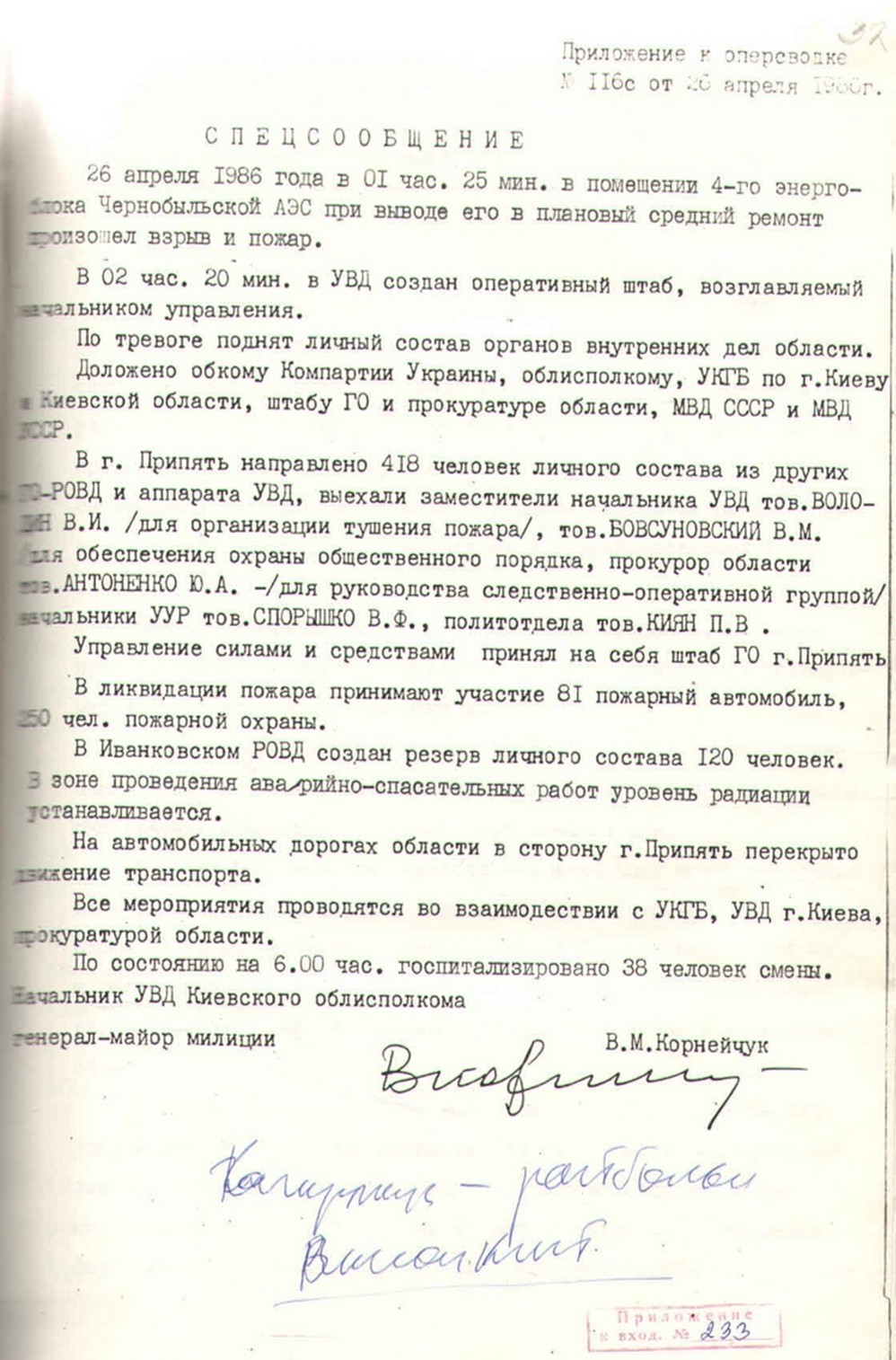 | Спеціальне повідомлення про аварію на Чорнобильській АЕС (ЧАЕС). 26 квітня1986 р. |
