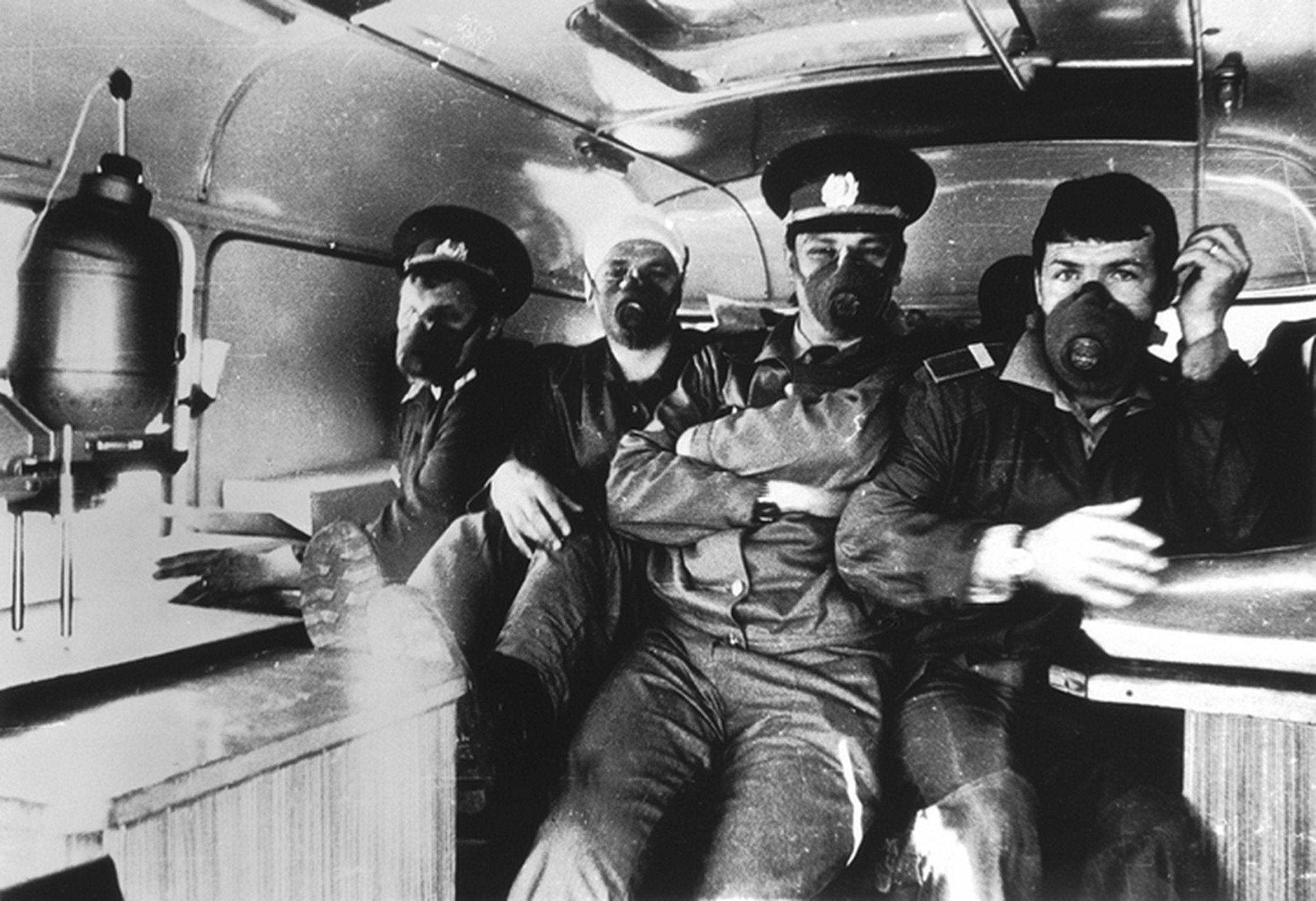 | Військові та працівники ДАІ в автомобілі на території, забрудненій після аварії на Чорнобильській АЕС ім. В. І. Леніна. м. Прип’ять Київської області, 1986 р. |