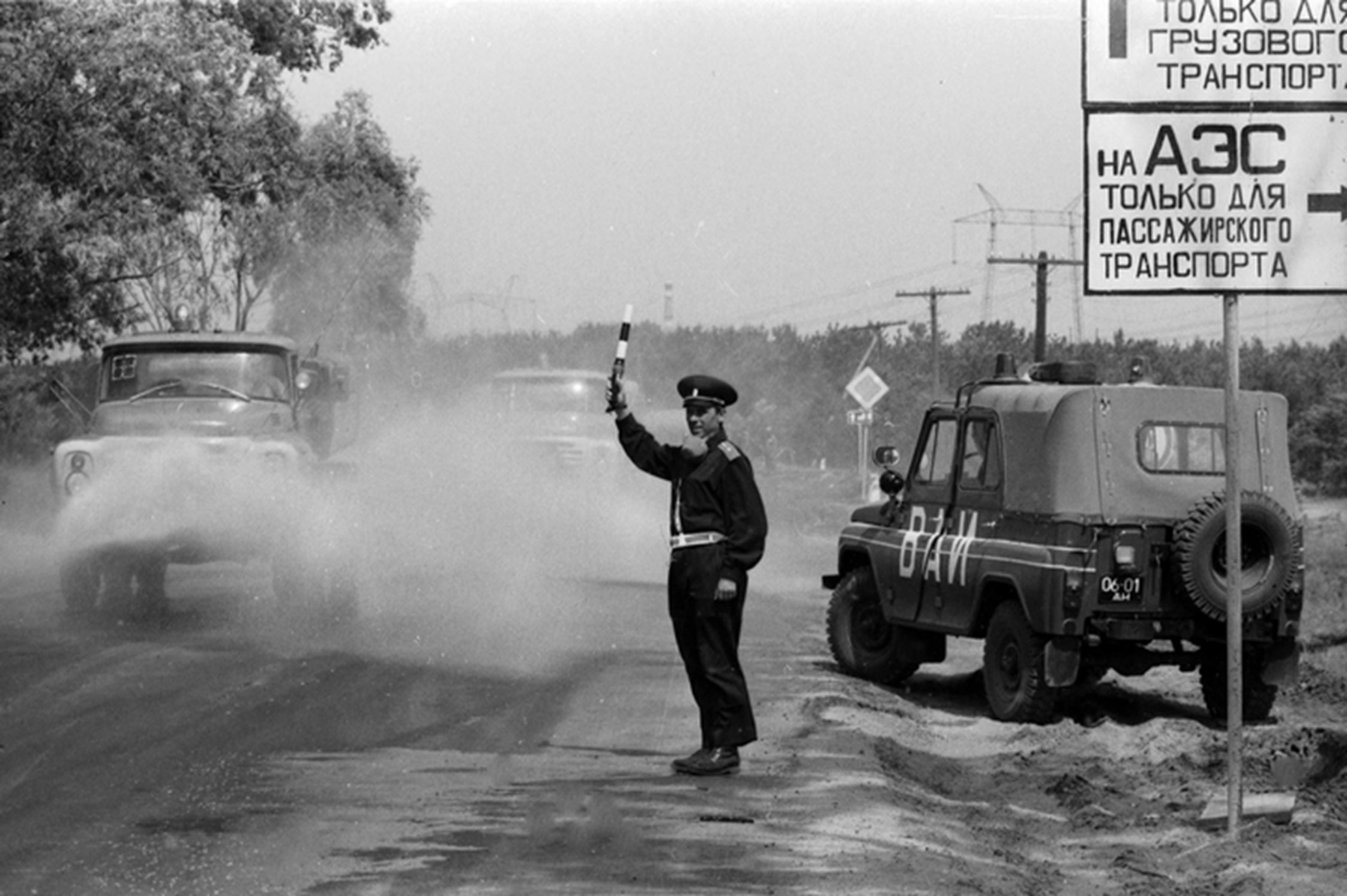 | Начальник військової автоінспекції сектору № 2, офіцер А. Решетняк регулює рух автотранспорту, що направляється в район аварії на Чорнобильській АЕС ім. В. І. Леніна. Чорнобильський район Київської області, травень 1986 р. Автор зйомки В. Зуфаров. |