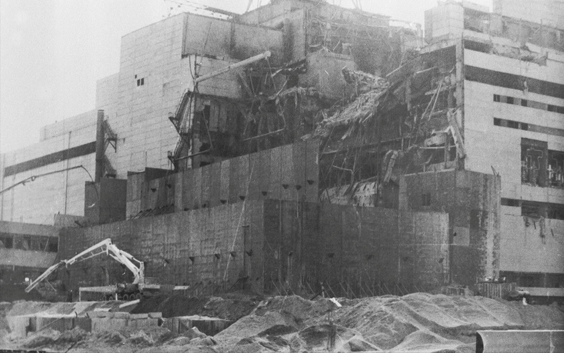 | Монтаж металоконструкцій перекриття та бетонування захисної стіни енергоблоку № 4 Чорнобильської АЕС ім. В. І. Леніна. Київська обл., 4 жовтня 1986 р. Автори зйомки В. Репік, В. Зуфаров. |