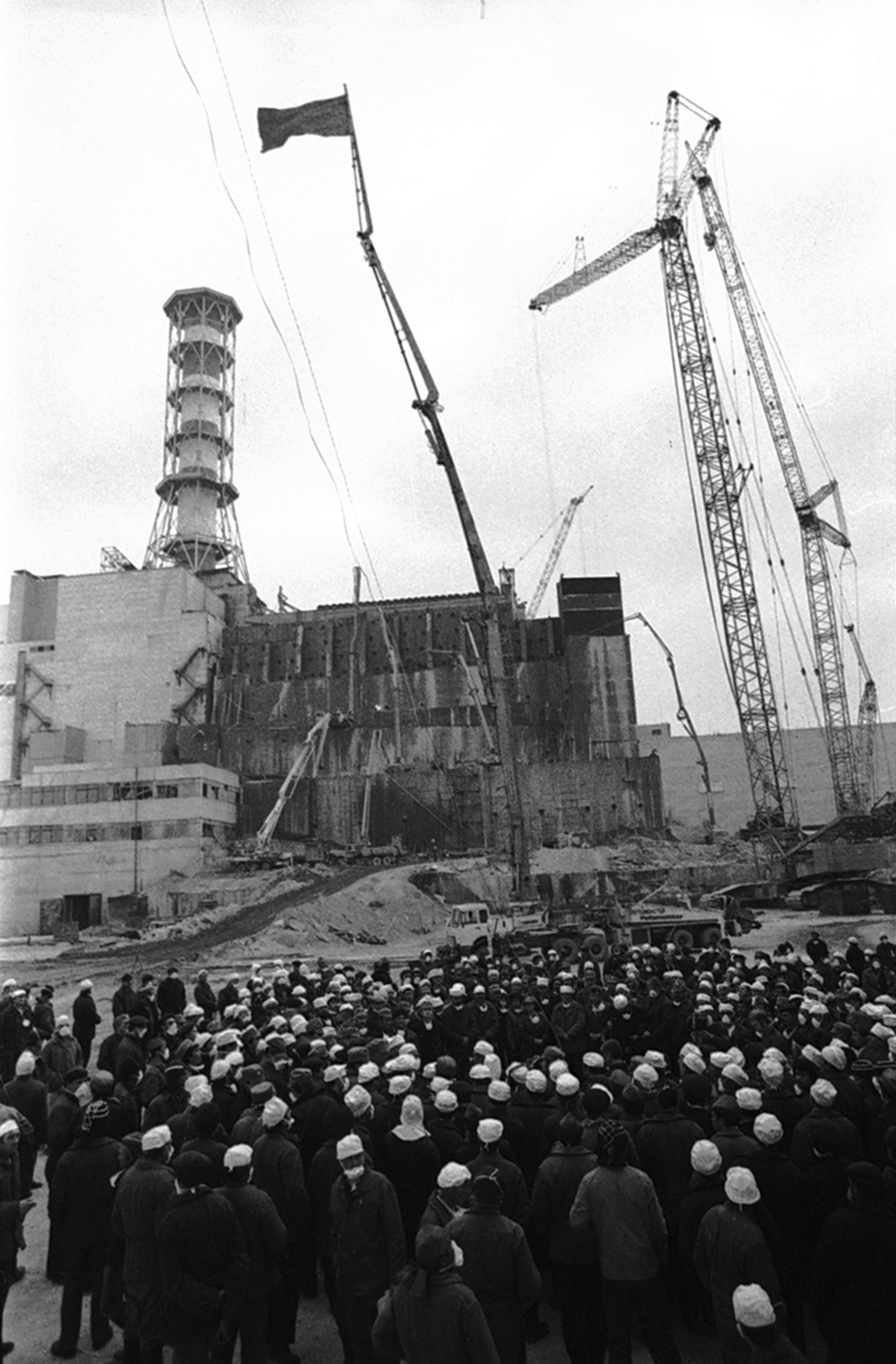 | Мітинг з нагоди завершення спорудження перекриття реакторного залу енергоблоку № 4 Чорнобильської АЕС імені В. І. Леніна. м. Прип’ять Київської області, 1986 р. Автор зйомки В. Фалін. |
